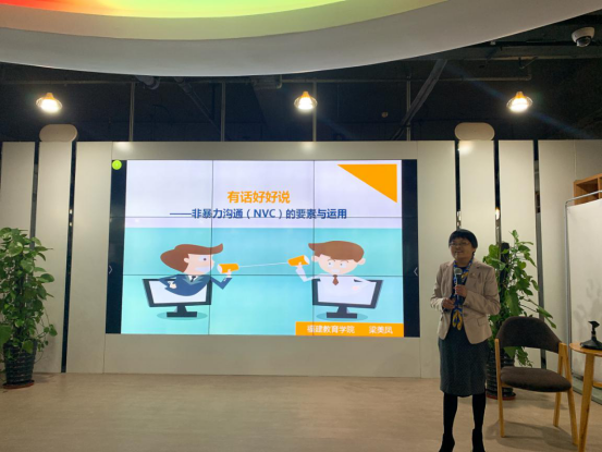 11月28日下午,本学期第四场“论道·启思”学术沙龙在三楼数字学习体验中心举行,由教育学院校长研修部梁美凤副教授主讲,题目为——《有话好好说——非暴力沟通的要素与应用》,资源建设与管理中心图书馆馆长黄国文主持,职业学院50余名学生参与活动。