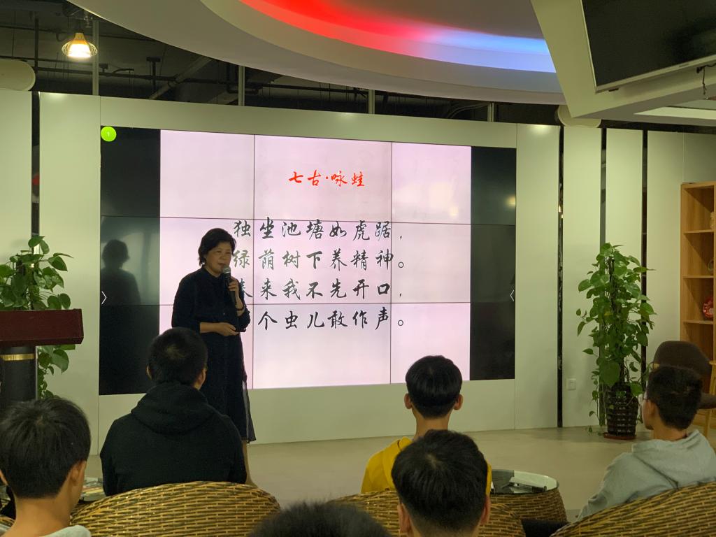 朱静老师在沙龙上同同学们共同诵读《沁园春·雪》、《忆秦娥·娄山关》、《七律·长征》等诗词作品,通过写作背景、写作方法等展开赏析。毛泽东诗词俯瞰历史兴衰,把握时代潮流,不但让同学们感受革命先烈筚路蓝缕,以启山林的豪情壮志,而且也深深被毛主席求真务实、惜时奋进的人格精神所感染。