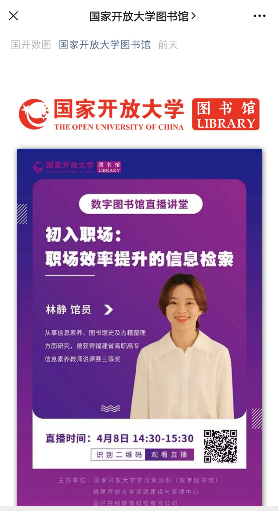 为提升图书馆资源的使用效率,促进我校与国家开放大学教育教学资源共享、共建,学校图书馆不断加强与国家开放大学学习资源部(数字图书馆)的资源服务合作。本学期,学校图书馆通过“论道·启思”沙龙平台与国家开放大学图书馆 “数字图书馆直播讲堂” 联合开展系列活动。这是国家开放大学图书馆首次与分部图书馆合作开展直播讲堂活动,也是至今唯一一家分部图书馆与国家开放大学图书馆合作开展系列活动。