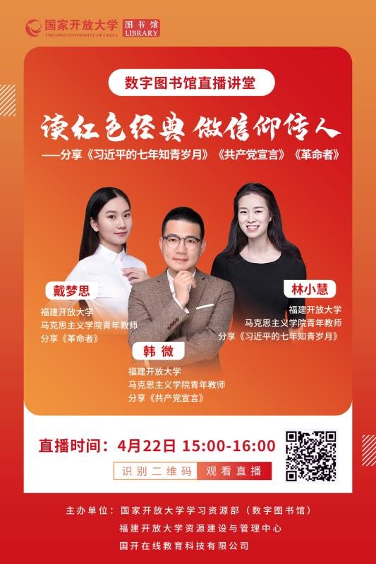 为迎接中国共产党建党100周年,引导广大师生从红色经典书籍中砥砺初心、汲取力量,将党史学习教育不断引向深入。4月22日下午,明德楼3楼数字学习体验中心迎来福建开放大学马克思主义学院青年教师韩微、戴梦思、林小慧,为大家带来“论道•启思”沙龙活动第六季第二讲“读红色经典做信仰传人”。