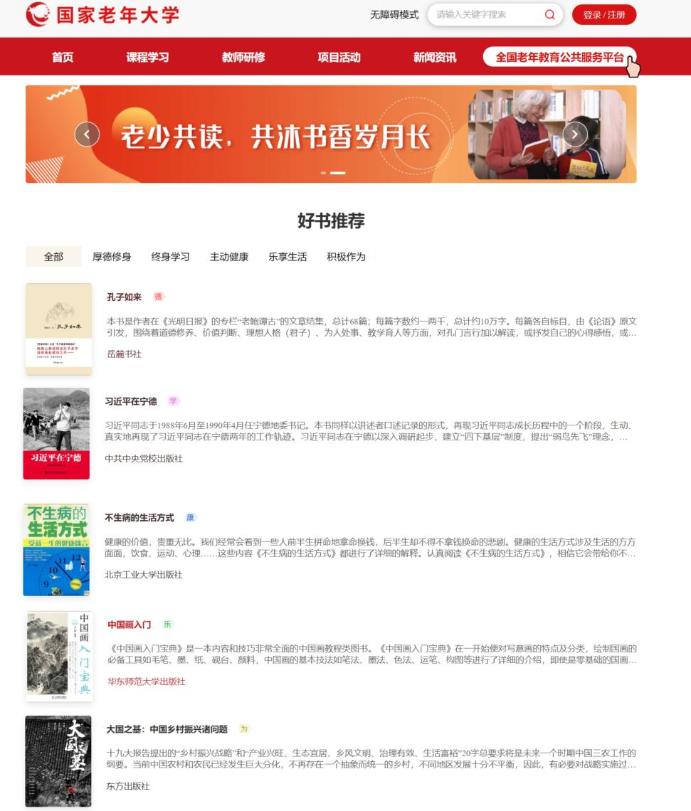 在此基础上,终身教育平台“全民阅读 书香中国”读书专区设立“优质好书”“精品好课”“精选听书”三大类别,汇聚国开自建以及喜马拉雅、爱奇艺、得到、央视频、京东读书等多个平台的优质读书资源,内容涵盖人文社科、自然科学、艺术等多个领域。“优质好书”下设中国名著、外国名著、社交沟通、心理学等多个系列,充实心灵,开阔眼界;“精品好课”下设养成阅读好习惯、名著解读、传统文化等多个系列,提升修养,启发思考;“精选听书”下设儿童智趣屋、中国文化经典、中华历史纵横多个系列,滋养智慧,引领成长。全国老年教育公共服务平台“老少共读 共沐书香岁月长”读书专区新增读书推荐、读书打卡、诵读展播、交流分享等栏目,打造多元互动的阅读空间,不断满足老年人多样化、个性化的阅读需求,丰富老年人精神文化生活。此次三大读书专区的全面更新,旨在满足读者不断变化的学习和阅读需求,鼓励更多人养成阅读习惯,提升自我修养与综合素质,进一步涵育爱读书、读好书、善读书的社会风尚。