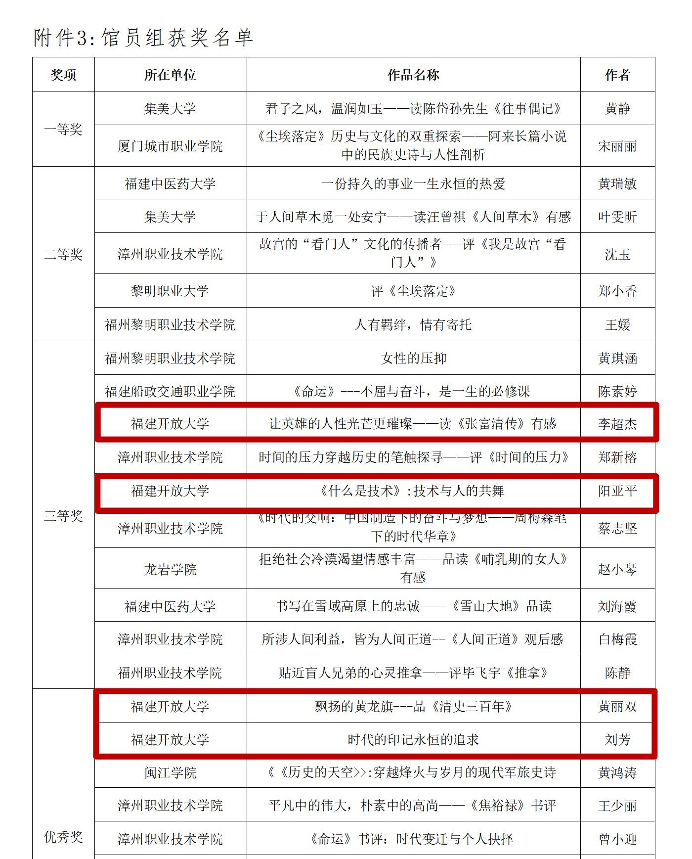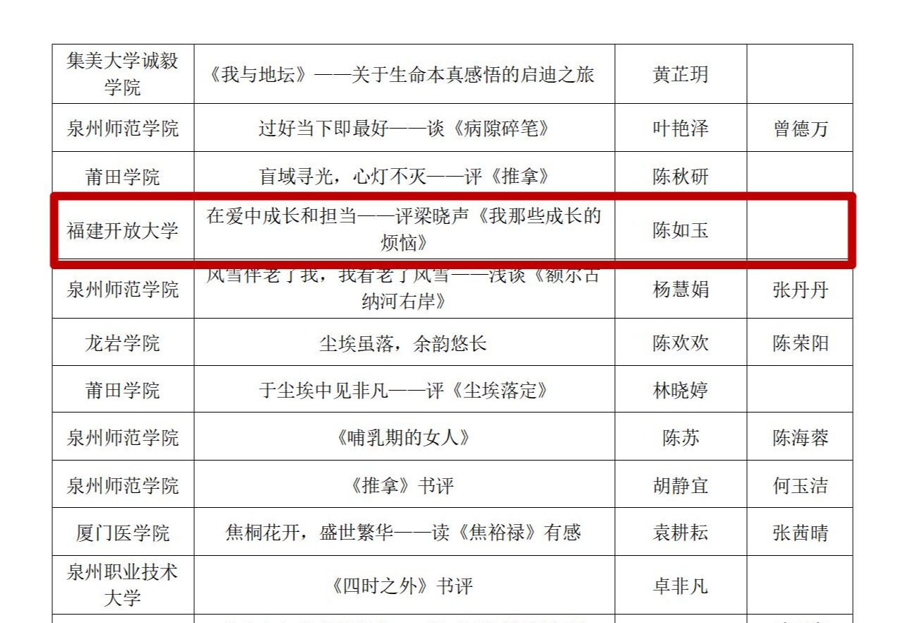 依照主办方的具体要求,福建开放大学学生工作处、团委、资源建设与管理中心紧密合作,精心策划并广泛动员了全省办学体系师生积极参与本次活动。活动共收到高质量投稿作品24篇,经评审,最终选出8篇优秀作品推荐参加省赛。下一步,学校将进一步加强大学生阅读推广活动力度,努力打造更具影响力、更具特色的阅读文化活动品牌,为校园文化建设注入源源不断的“书香力量”。