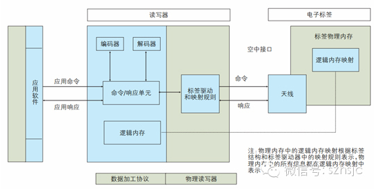 其中,射频模块包括电源装置、射频振荡器、射频处理器、射频接收器、前置放大器。射频振荡器产生信号,通过射频处理器调制发射信号,送往天线发送给电子标签。从电子标签发回的信号,由射频接收器接收并经过放大送往控制模块处理。控制模块负责与应用系统软件进行通信,并且控制读写器和电子标签的通信,是读写器的头脑部分。它接收应用系统软件发送来的指令,经过信号的编码加密送到射频模块调制经天线发送给标签。对电子标签发来的信号解调、解码、解密传送给应用系统软件(如图2)。