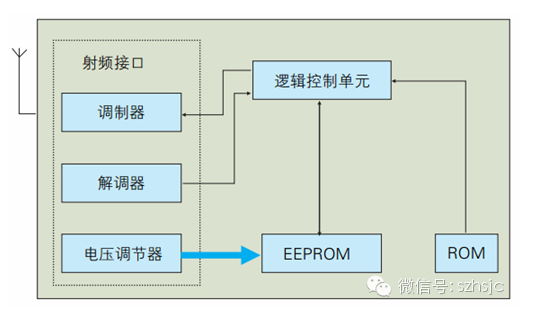 电子标签(Tag),是射频识别系统真正的数据载体。每个电子标签都有唯一的电子编码,一般附在所要监测的物体上通过电磁波与读写器进行无线数据交换,具有智能读写和加密通信的功能(如图 3)。电子标签接收读写器发来的信号,并将其一部分整流为直流电源供电子标签内的电路工作,另一部分能量信号经过解调器解调后送往逻辑控制单元解码。根据读写器的要求送回数据经过调制后由天线发给读写器。